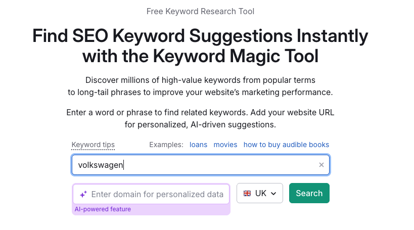 In SEMrush, click on SEO in the left-hand menu and then select Keyword Magic Tool.