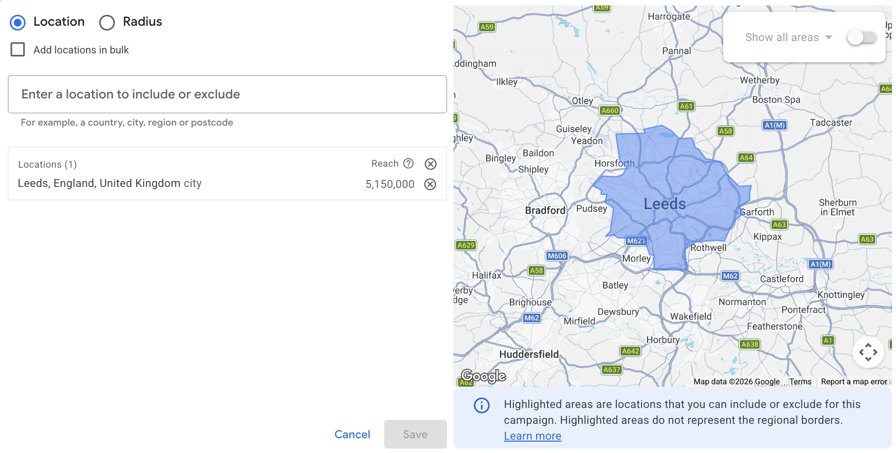 For example, if I primarily work with businesses in Leeds, I can target that location specifically in the campaign settings.